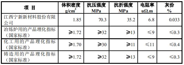 在特种石墨材料的性能方面,体积密度、抗压强度、抗折强度、电阻率和灰份等是重要指标。以公司标准三焙化产品为例,各项指标与中华人民共和国国家质量监督检验检疫总局、中国国家标准化管理委员会发布的细颗粒高密度特种石墨产品国家标准的对比情况如下表所示:
